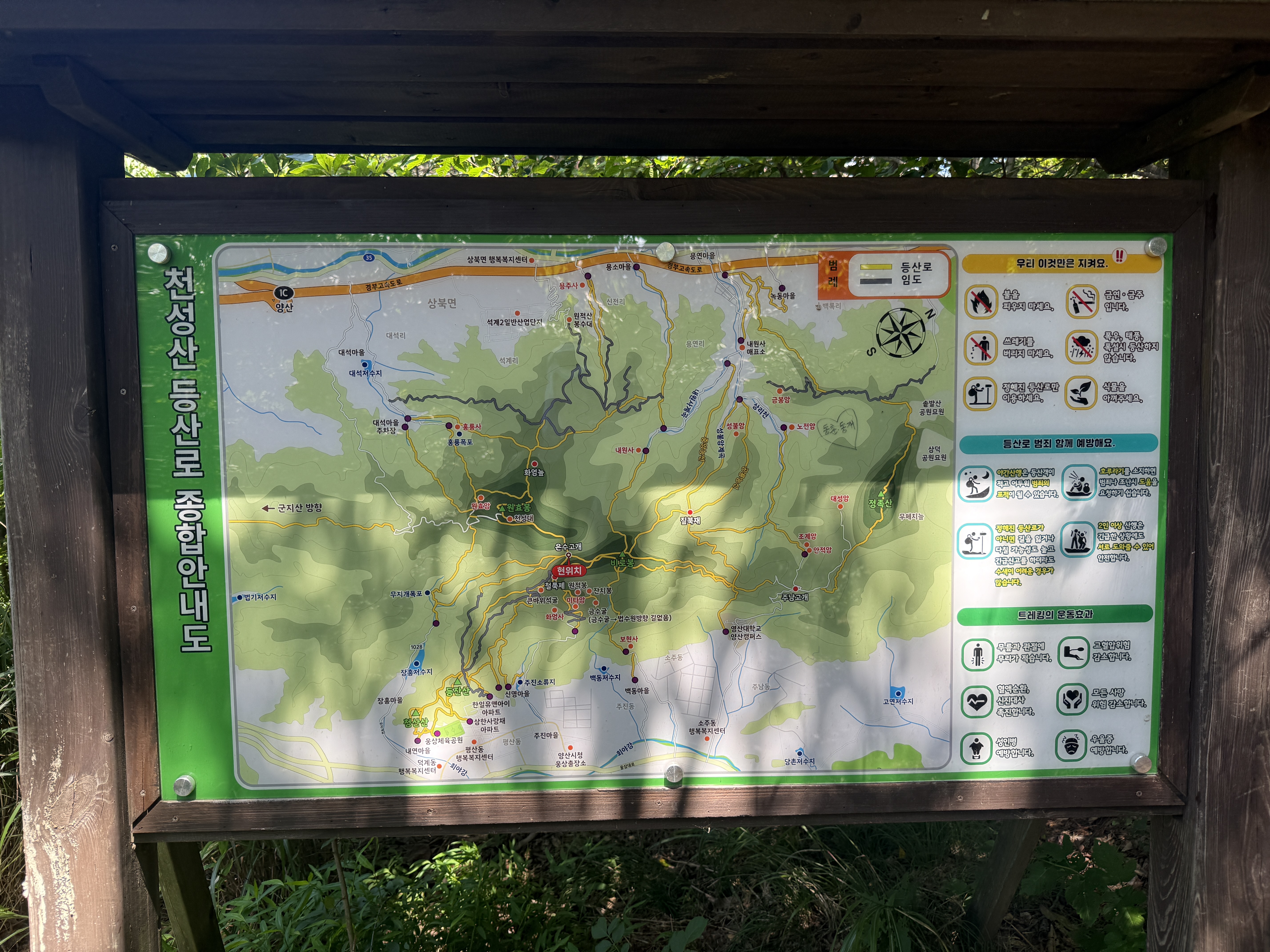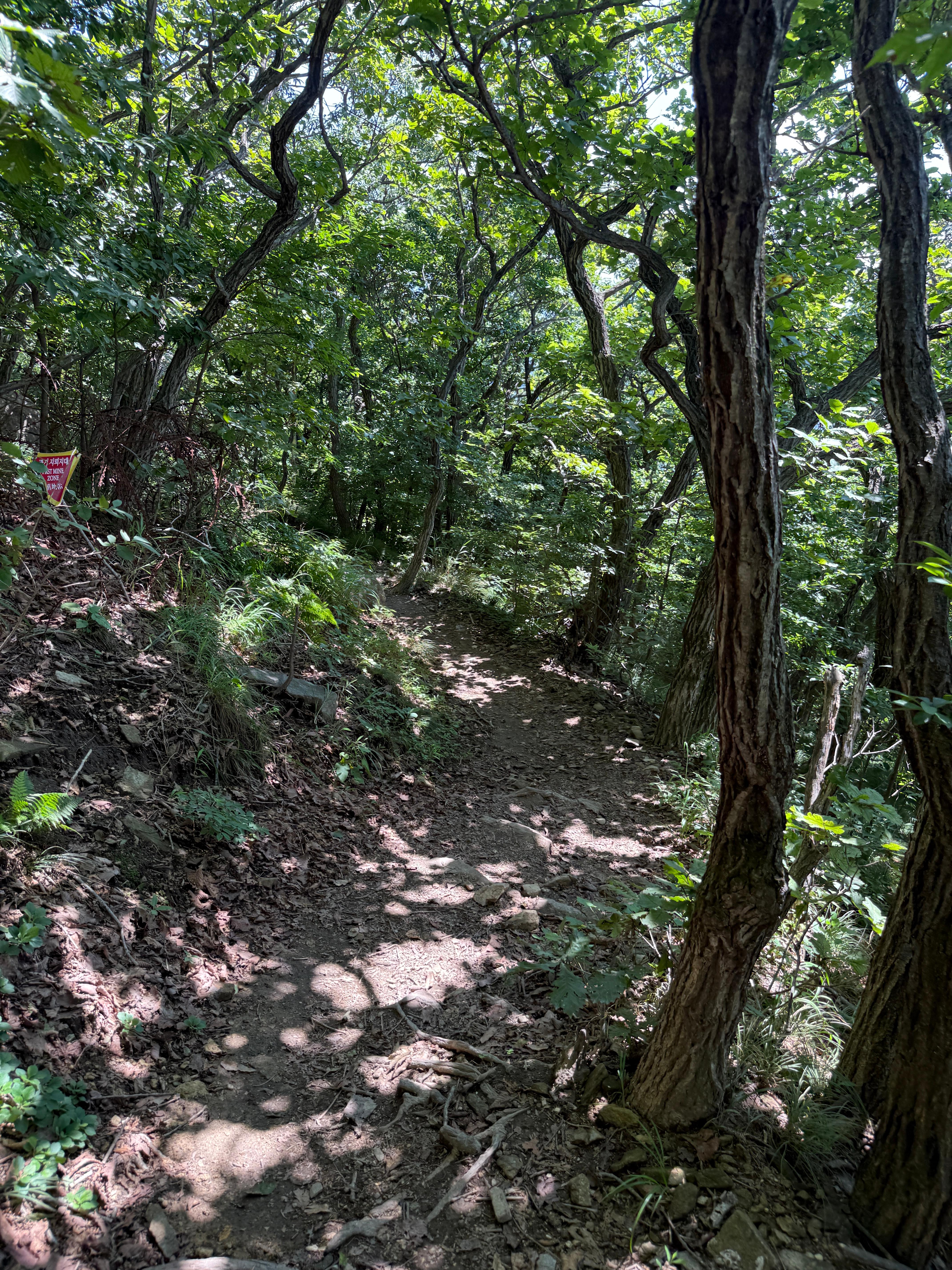 원효암 주차장을 출발하면서 천성산 등산코스의 첫 느낌은 ‘생각보다 순하다’였습니다. 처음 몇 분은 완만하게 이어지는 숲길을 따라 걸을 수 있었고, 울창한 숲이 햇빛을 가려주니 한여름에도 크게 덥지 않았습니다. 하지만 그 평온함은 오래가지 않았습니다. 조금만 올라가자 바로 가파른 구간이 시작되었고, 숨이 턱까지 차오르며 이 산이 만만치 않다는 걸 실감할 수 있었습니다. 특히 과거 지뢰지대였음을 알리는 경고 문구와 녹슨 철조망이 이어진 길은 마치 다른 세상에 들어선 듯한 긴장감을 주었습니다. 길은 분명히 안전하게 정비되어 있었지만, 녹슨 철망과 경고판이 풍기는 묘한 분위기는 천성산 등산코스의 독특한 인상을 각인시켜주었습니다.