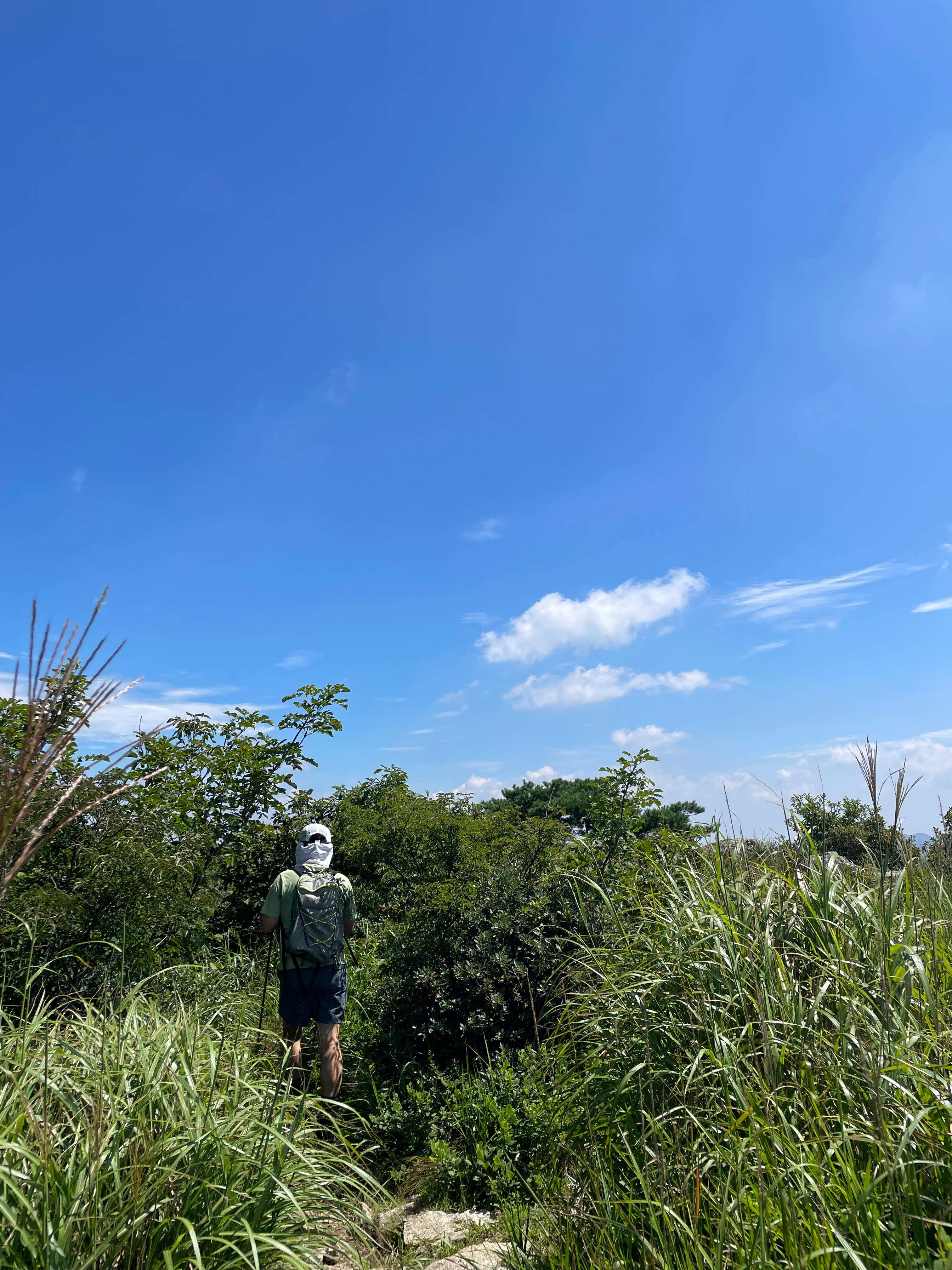 이곳에서 잠시 발걸음을 멈추고 풍경을 감상한 뒤 다시 능선을 따라 걸었습니다. 천성산 등산코스의 장점은 바로 이 능선길이라 생각됩니다. 너무 험하지 않고, 그렇다고 지루하지도 않은 길이 이어지는데, 한쪽으로는 양산시내와 멀리 부산 방향의 산줄기가 펼쳐지고, 또 다른 쪽으로는 억새가 자라나는 넓은 초지가 시야를 시원하게 터줍니다. 특히 가을에 이 능선길을 걸으면 억새가 바람에 흔들리며 만들어내는 장관이 압권이라 많은 이들이 그 계절을 추천한다고 들었습니다. 이번에는 여름이었지만, 푸르른 풀빛만으로도 충분히 만족스러웠습니다.