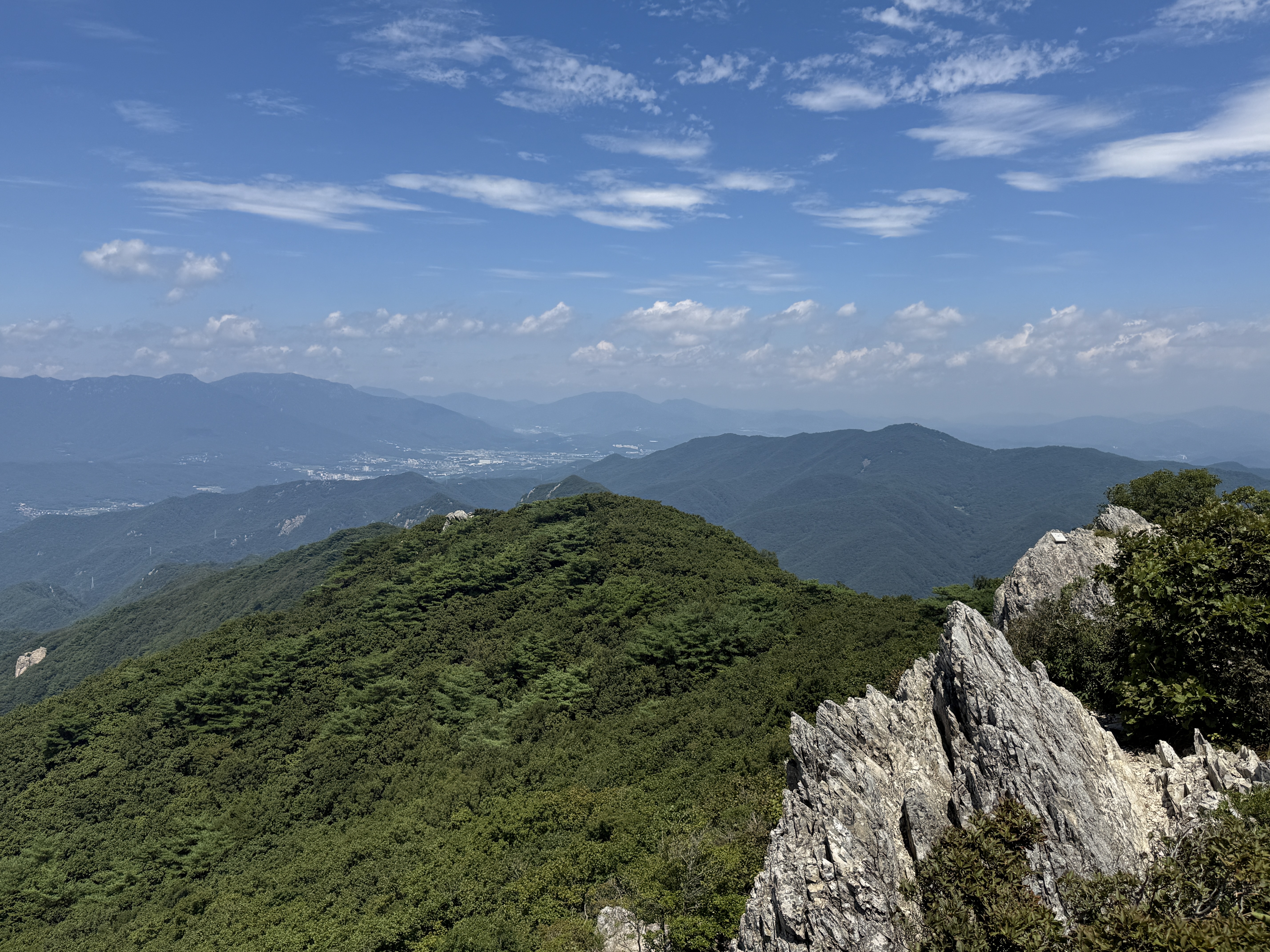 비로봉에 올라서자 그동안의 피로가 단번에 잊히는 듯했습니다. 탁 트인 360도 조망이 기다리고 있었기 때문입니다. 주변 산세가 겹겹이 이어지는 모습, 저 멀리 펼쳐지는 양산시 전경, 그리고 하늘과 맞닿은 듯한 시원한 능선은 말 그대로 장관이었습니다. 천성산 등산코스의 하이라이트가 바로 이 비로봉이라는 사실을 몸소 느낄 수 있었습니다. 정상에서 불어오는 바람은 여름의 무더위를 단번에 날려주는 듯했고, 한참 동안 자리를 떠날 수 없을 정도로 감동적이었습니다.