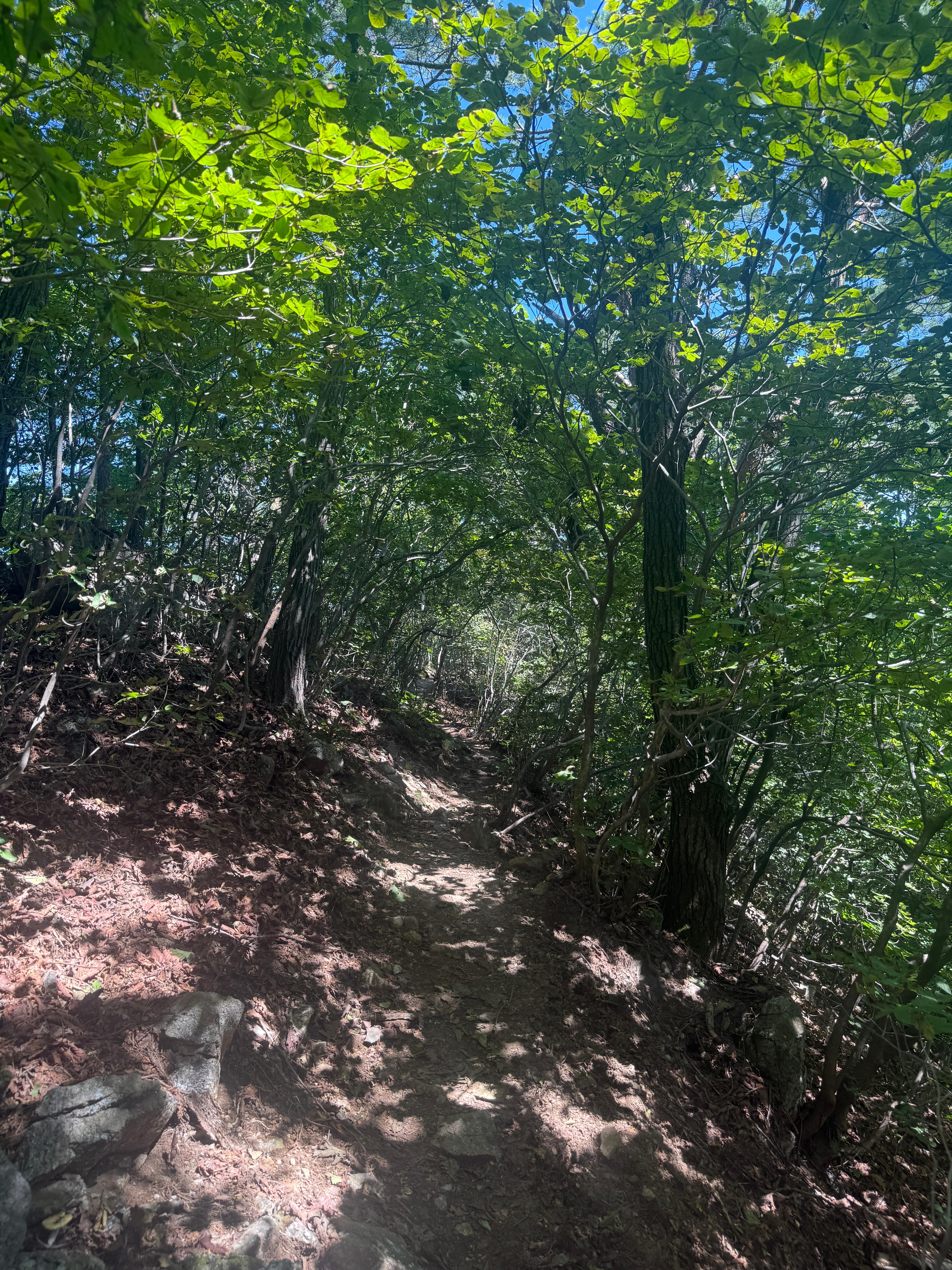 그리고 시작하자마자 밀려오는 건, 예상 밖의 가파른 오르막. 솔직히 “최단코스니까 편하겠지”라는 마음이 있었는데, 그 생각은 몇 걸음 안 가 깨져버렸다. 숨은 금세 차올랐고, 종아리는 빠르게 뻐근해졌다. 이래서 산은 방심하면 안 된다. 오봉산 등산코스가 짧다고 얕보면 금세 산에게 혼이 난다. 그래도 숲이 울창하게 드리워져 있어서 뙤약볕은 막아주었다. 여름의 뜨거운 날씨였지만 숲길 속은 오히려 서늘했고, 직사광선이 없다는 건 큰 위안이 되었다.